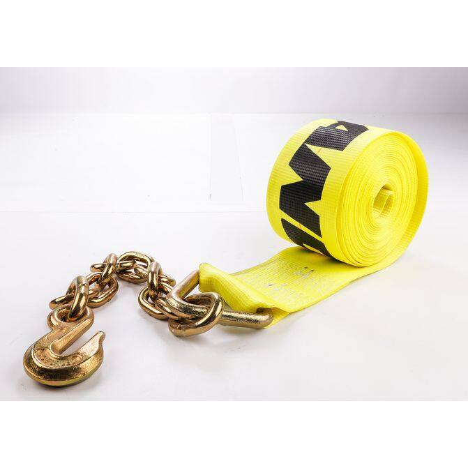The Ancra 4" x 30' Heavy Duty Winch Strap with Chain Anchor 5400-lbs Load Limit is the perfect solution for securing heavy loads. This strap is made from polyester webbing for superior strength and resistance to wear and abrasion. The chain end with a clevis hook can easily hook onto a vehicle's anchor points, providing a secure attachment for the cargo. Whether you're hauling a trailer, a boat, or any other heavy load, it is the perfect solution for your needs.