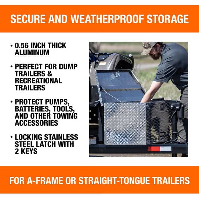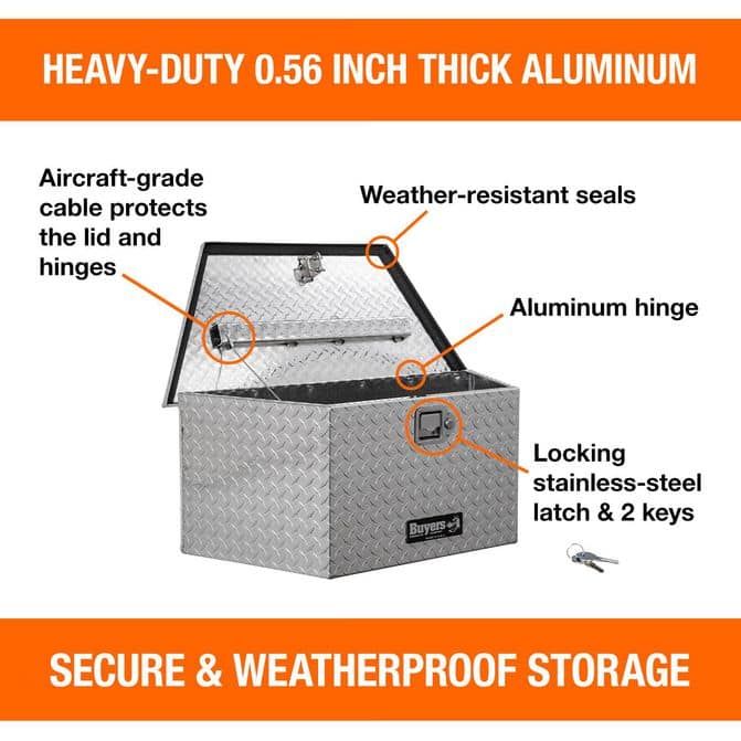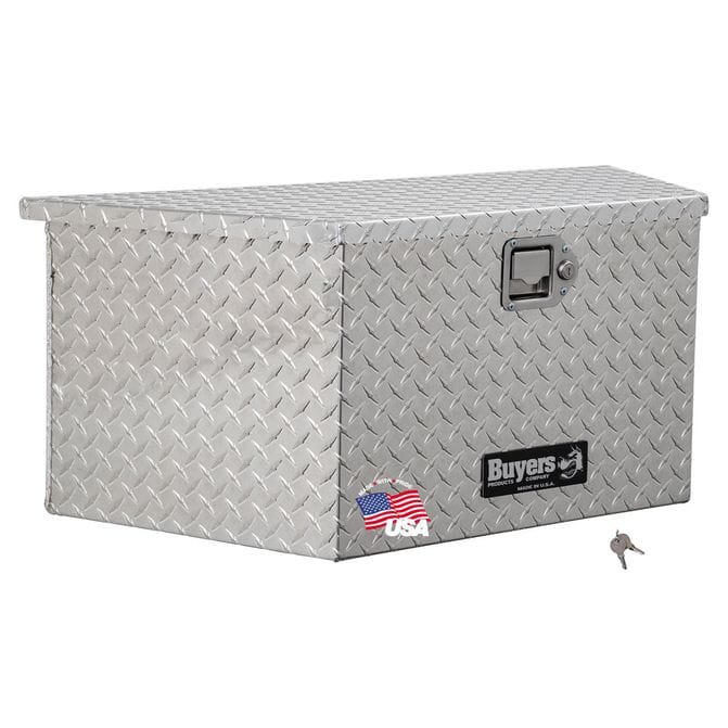 • The Buyers 14.83" x 15.24" x 35.22" Wide Diamond Tread Aluminum Tongue Truck Box is the perfect solution for keeping your cargo safe and secure. Constructed with a sturdy angle front design, this box is designed to mount to the front of A-frame style trailers. The box contents stay safe and secure behind a rugged aluminum lid and continuous hidden hinge. This box is perfect for use with A-frame trailers, truck equippers, truck installers, truck upfitters, and more.
