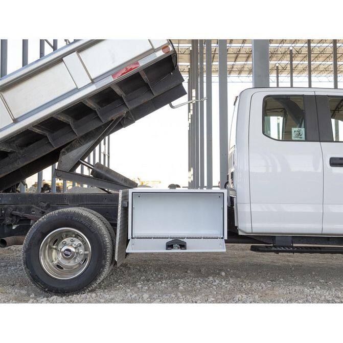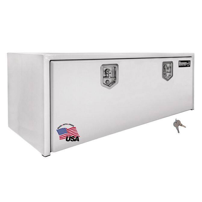 • Protect and easily access your equipment with the Buyers Products White Steel Underbody Truck Box. Available in a variety of sizes, each professional-grade truck tool box has a rugged 14 Ga steel body that can handle the harshest job sites. The truck toolboxes are powder-coated inside and out for superior corrosion resistance and style. The continuous hidden hinge and replaceable gasket system keep weather and grime away from your tools. Aircraft-grade cables help prevent damage. The locking, stainless steel compression latch provides a tight seal and deters theft. Mount the box on any flat surface or under your truck using Buyers Products Mounting Brackets (sold separately, see "Accessories" below).