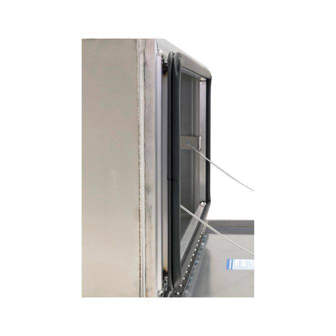 The rigid, extruded door frame and 0.125 in. thick smooth aluminum provide maximum durability. The external rain gutter with an automotive bulb seal will protect tools and equipment from moisture and grime. The 3-point locking, die-cast compression latch will provide maximum security no matter how rough the road gets. Corrosion-resistant, and built to last, the stainless steel bolt-on hinge with a 1/4" pin ensures long-lasting use and durability.