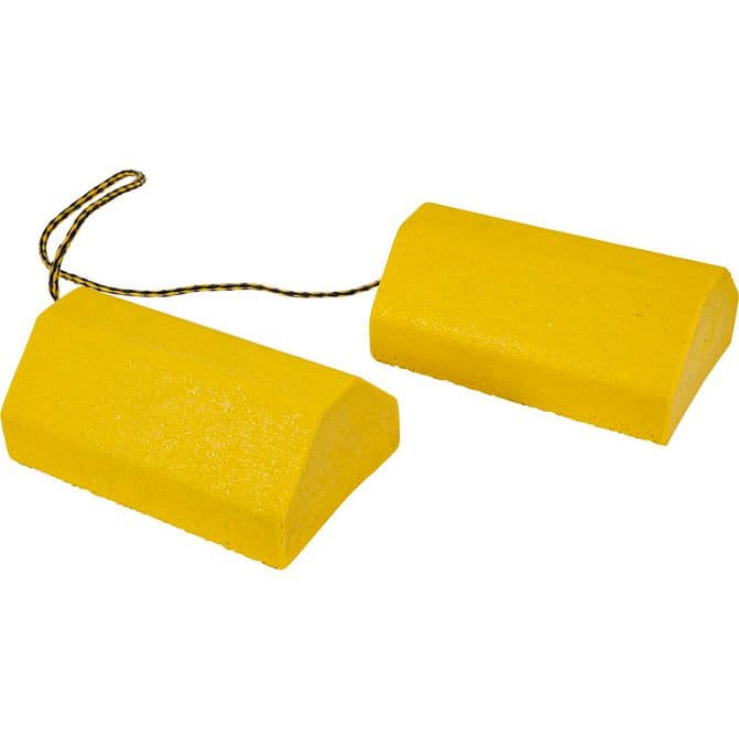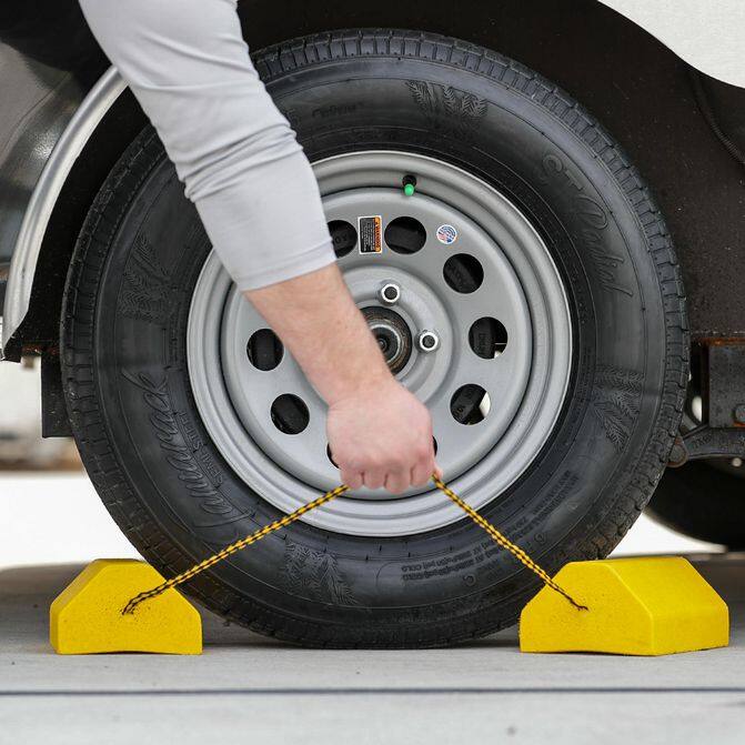• Buyers Products Composite Wheel Chock Set fits snugly under wheels to keep vehicles in place while they are serviced or parked. Constructed from 100% recycled composite in bright safety yellow, the wheel chock set is resistant to oils and chemicals and will not deteriorate or rot. Attached with a 32-3/4 in. rope, the chocks are lightweight and perfect for many applications.