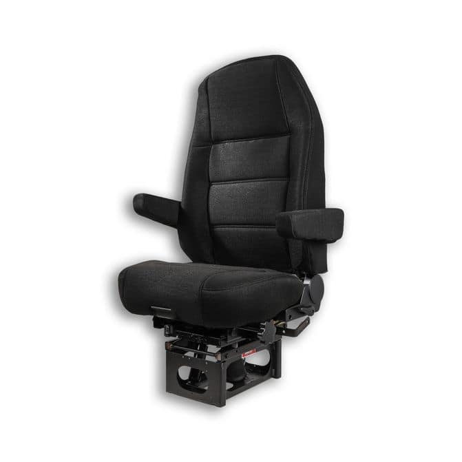 The Commercial Vehicle High Back Lumbar Air Ride Seat is the perfect choice for any truck driver looking for a comfortable and reliable seat. This seat features a high back with dual arm sets and a Mordura fiber cloth finish in black. The air ride suspension provides superior comfort and support, while the adjustable lumbar support ensures maximum comfort and ergonomic support. The durable construction and stylish black finish make this seat a great choice for any truck driver. FleetPride is your First Click in Heavy Duty®. - Patriot truck seat