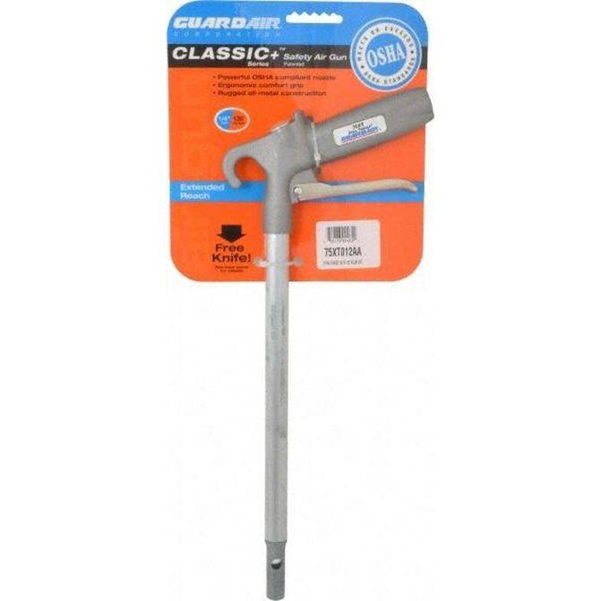Manufacturer Part Number: 75XT012AA|Body Style|Pistol GripTip Type|Safety Extension TubeTip Diameter|Thread Standard|FNPTInlet Size|0.25inOutlet Size|Maximum Working Pressure|Body Material|AluminumNozzle Material|Air Consumption (LPM)|Standard Cubic Feet Per Minute|54.00Color|Decibel Rating|108Standards|OSHA CompliantFinish|Overall Length|15.4000inApplication|Features|Rugged Aluminum ExtensionTube Material|Contents|OSHA/ANSI Compliant|Maximum Transmissible Thrust|Air Consumption CFM|Maximum Temperature (F) ( - 0 Decimals)|Tube Length (Inch)|12Minimum Temperature (Deg F - 3 Decimals)|Inlet Thread Size|1/4 NPTProduct Service Code|5130UNSPSC Code|