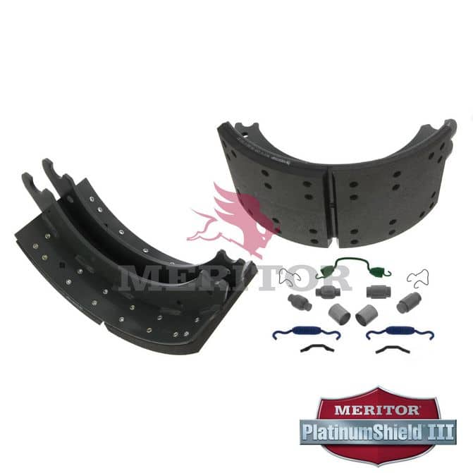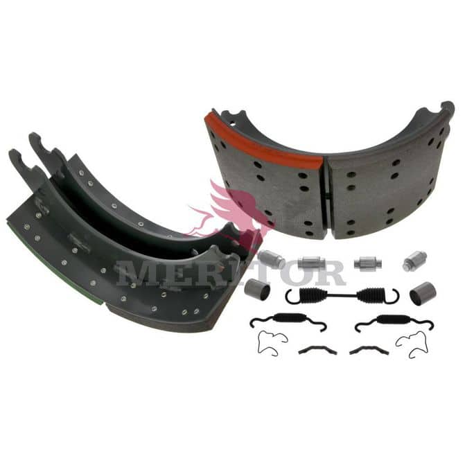 Update your truck with improved brake drum integrity, with the Meritor Relined Brake Shoe Kit 23K GAWR that ensures you're Ready for the Road Ahead™. This replacement kit updates the key components of a brake drum, allowing the mechanism to once again create friction to slow a vehicle. Manufactured with a self-adjustment mechanism to provide enhanced responsiveness and long-term reliability. FleetPride is your First Click in Heavy Duty®. - Asbestos-free wear surface and backing layer