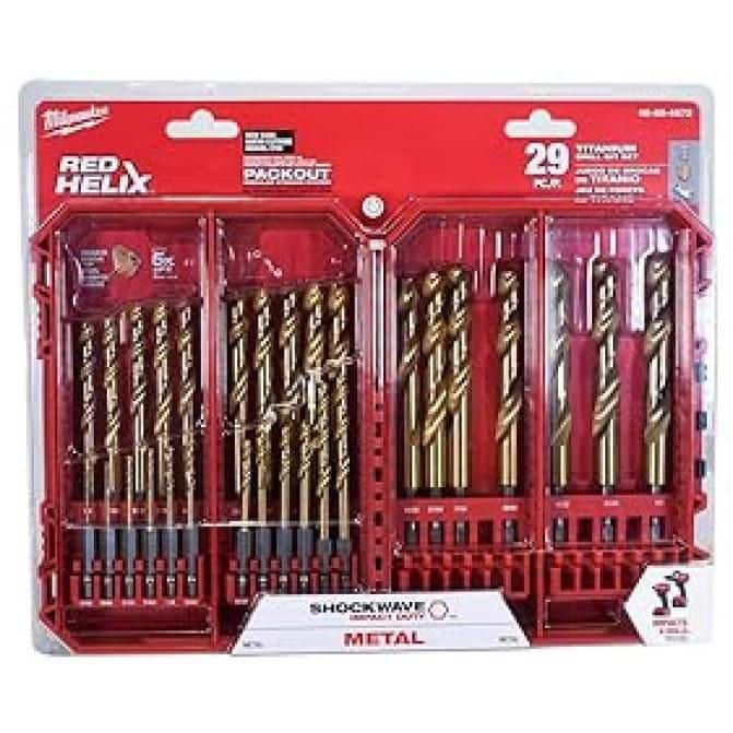 The MILWAUKEE® SHOCKWAVE Impact Duty™ 29PC RED HELIX™ Titanium Drill Bit Set is engineered for extreme durability and long life. The QUAD EDGE™ tip delivers a precision start and features four cutting edges to create smaller chips for faster material removal and less heat leading to improved performance. Designed with a VARIABLE HELIX™ flute that begins with an aggressive 35° helical angle and ends at 15° for rapid chip removal. The bits also feature an internal thicker tapered web that greatly increases strength, reducing premature breakage. Ideal for various applications including but not limited to wood, plastics, and metals. MILWAUKEE® RED HELIX™ Titanium Drill Bits provide up to 5X life vs. black oxide drill bits. Set is organized in a customizable accessory case designed for use in PACKOUT™.