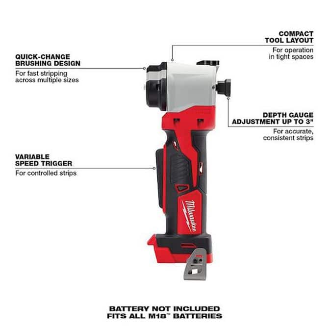 • The Milwaukee® M18™ cable stripper vastly improves the cable stripping experience. With N exposed blades, the cordless cable stripper provides safer stripping than with a knife. The cable stripper's compact, right-angle design enables users to maneuver it more easily in tight spaces with less strain on the wrist. The bushing design and adjustable depth gauge deliver cleaner, more accurate and consistent strips across all sizes. The cable jacket stripping tool is Nt only compatible with all Milwaukee bushings but is also compatible with competitive quick-change bushings.