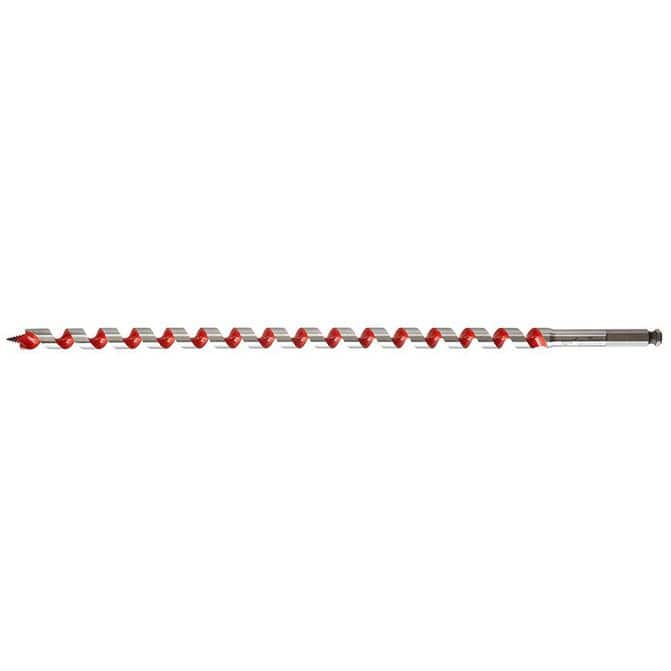 The Milwaukee® 5/8 in. x 18 in. Ship auger bit drills through up to 2X the nails of competitive auger bits without needing resharpening. Drill into clean or nail-embedded wood with confidence when installing Romex wire, PEX water lines, rebar, bolts, and rope in piers, playground equipment and landscaping. The flutes are wider for maximum chip removal, even in deep holes. The polished and coated flute finish means chips won't stick to the bit, even when drilling in material that contains sap or glue. The through-center cutting design creates a more solid striking point against nails compared to the competitions' ahead-of-center and behind-center designs. The longer shaft length makes it easy to drill deeper or overhead without an extension.