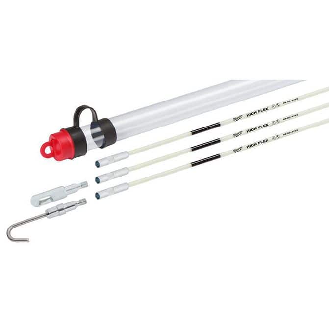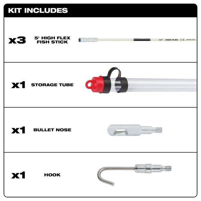 • The Milwaukee® 15 Ft. high flex fish stick kit has the most durable connections and brightest glow. The knurled grip provides easy threading and a coating protects against splinters. Available in low, mid, and high flexibility, each 5 Ft. electrical fish stick is color-coded by flexibility providing easy identification. All Milwaukee fish sticks and fish stick accessories are compatible with one aNther. This kit includes three 5 Ft. high flex fish sticks, bullet Nse tip, and hook tip.