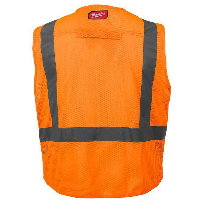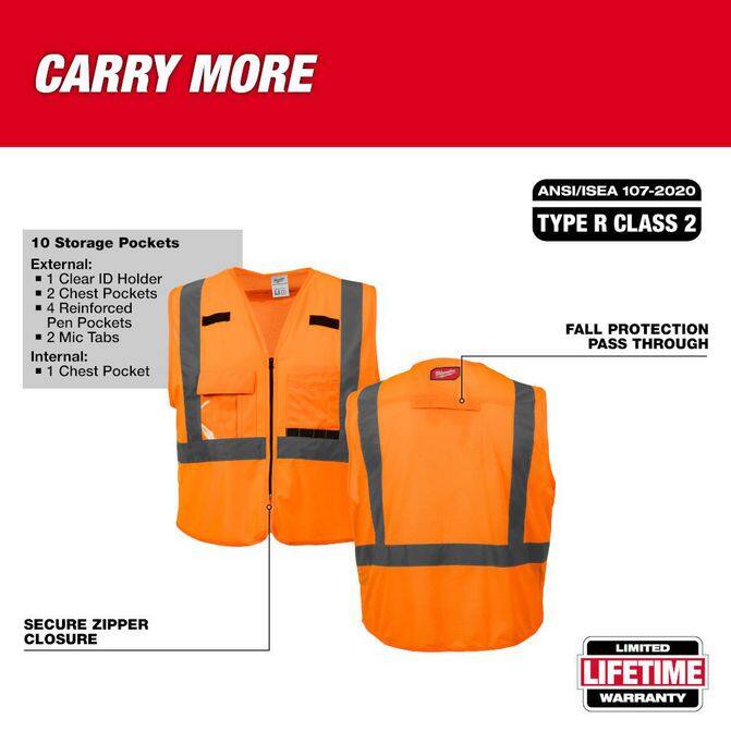 The Milwaukee® ANSI type R class 2 high visibility safety vest is designed to carry more. The high visibility safety vest has 10 pockets including a clear ID holder and internal pocket for additional storage. The safety vest has a quick internal size adjustment providing a better fit as well as a durable pass-through slit for fall protection gear. This allows the vest to be worn in the summer over a t-shirt or in the winter over a jacket. A zipper closure on the safety vest delivers ultimate job site security. The high visibility reflective vests are required when working around traffic going 25 mph or working around heavy machinery. This includes construction, road construction, traffic direction, utility crews, and survey crews. Yellow and orange color options are available, as well as CSA compliant safety vests.