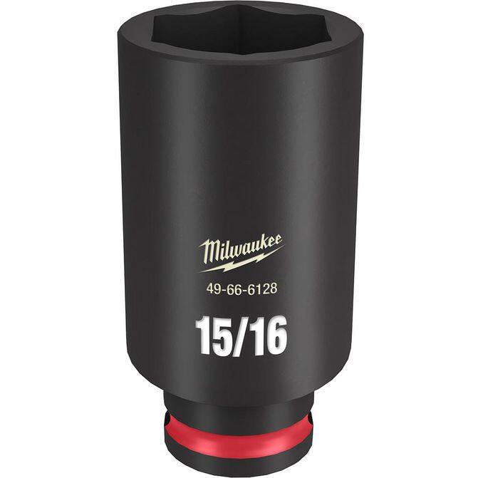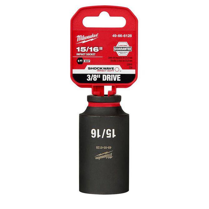 • The MILWAUKEE® SHOCKWAVE Impact Duty™ 3/8" Drive 15/16" Deep 6 Point Socket features the boldest, longest-lasting markings and extreme impact durability in high torque applications. The stamped and ink-filled size marking enables an accurate socket selection every time throughout the life of the socket. Engineered with high-strength forged steel for optimized performance in heavy-duty applications, and a Nn-slip hex geometry prevents fastener rounding. The dual-hole design and ring groove allow for easy socket attachment and removal. All SHOCKWAVE Impact Duty™ Sockets are backed by a Lifetime Guarantee and meet ASME industry standards.