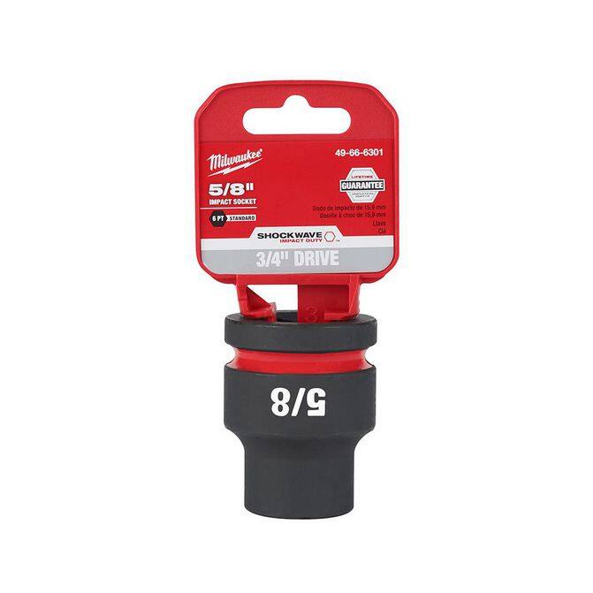 • The MILWAUKEE® SHOCKWAVE Impact Duty™ 3/4" Drive 5/8" Standard 6 Point Socket features the boldest, longest-lasting markings and extreme impact durability in high torque applications. The stamped and ink-filled size marking enables an accurate socket selection every time throughout the life of the socket. Engineered with high-strength forged steel for optimized performance in heavy-duty applications, and a Nn-slip hex geometry prevents fastener rounding. The dual-hole design and ring groove allow for easy socket attachment and removal. All SHOCKWAVE Impact Duty™ Sockets are backed by a Lifetime Guarantee and meet ASME industry standards. Compatible with optional Retaining Ring (49-66-6743).
