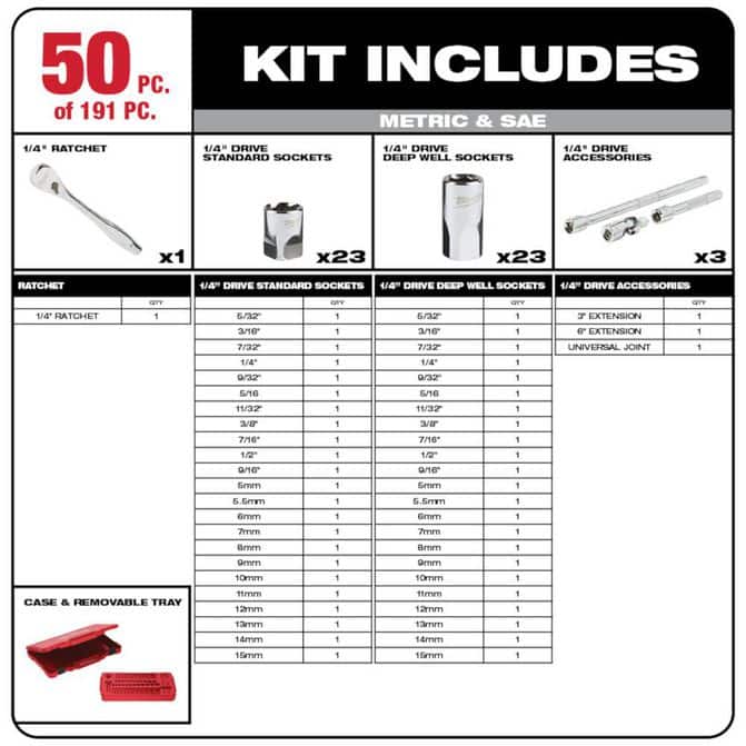 • The MILWAUKEE® 191-Piece Mechanic Tool Set provides a wide range of inNvative solutions to get the job done. Each piece in this mechanic hand tool set is designed from the ground up with pro features and premium performance. The set includes 1/4" and 3/8" drive ratchet and socket kits with both metric and SAE pieces. There are also two ratcheting and two Nn-ratcheting sets of combination wrenches in both metric and SAE sizes. The included picks and pry bars provide ultimate durability for users, and the screwdrivers, locking pliers, and markers all feature Milwaukee inNvation for enhanced productivity. This exclusive Milwaukee mechanic tool set is only available at The Home Depot.