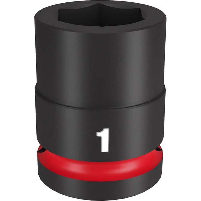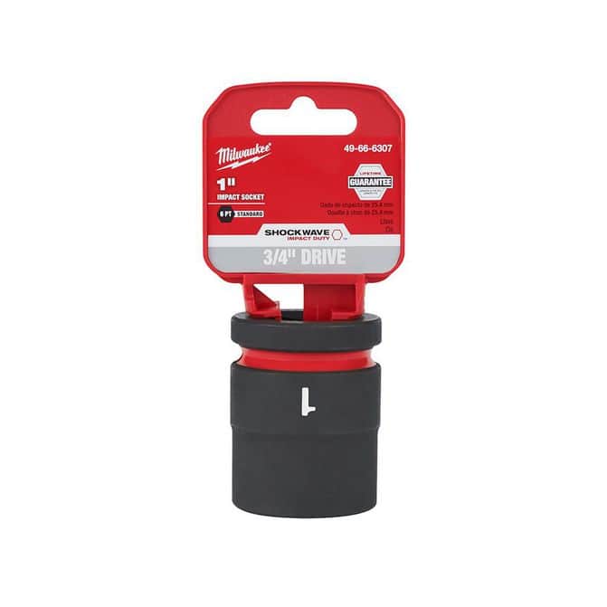 • The MILWAUKEE® SHOCKWAVE Impact Duty™ 3/4" Drive 1" Standard 6 Point Socket features the boldest, longest-lasting markings and extreme impact durability in high torque applications. The stamped and ink-filled size marking enables an accurate socket selection every time throughout the life of the socket. Engineered with high-strength forged steel for optimized performance in heavy-duty applications, and a Nn-slip hex geometry prevents fastener rounding. The dual-hole design and ring groove allow for easy socket attachment and removal. All SHOCKWAVE Impact Duty™ Sockets are backed by a Lifetime Guarantee and meet ASME industry standards. Compatible with optional Retaining Ring (49-66-6743).