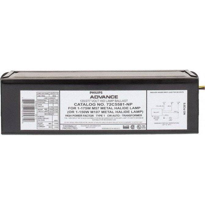 • Manufacturer Part Number: 72C5581NP001|Ballast Type|Lamp Type|Ballast Start Type|Circuit Type|Thermal Protection|Ballast Factor|Voltage|Number Of Wire Leads|Minimum Lamp Wattage|Maximum Lamp Wattage|Housing Material|Minimum Amperage|Maximum Amperage|Frequency|Overall Length|Overall Width|Overall Height|Minimum Starting Temperature|Minimum Operating Temperature|Includes|DLC Listed|Standards|UNSPSC Code|