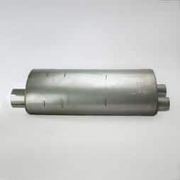 The Power Products 25-1/4" Round Muffler is designed to provide excellent noise reduction for a quieter operation. It is manufactured with high-quality materials for durability and longevity. This muffler helps to improve engine performance by reducing backpressure. This muffler features a side inlet/end outlet configuration type.. It offers increased fuel efficiency and reduced emissions, making it an ideal choice for any vehicle. FleetPride is your First Click in Heavy Duty®. - Side inlet/end outlet configuration type