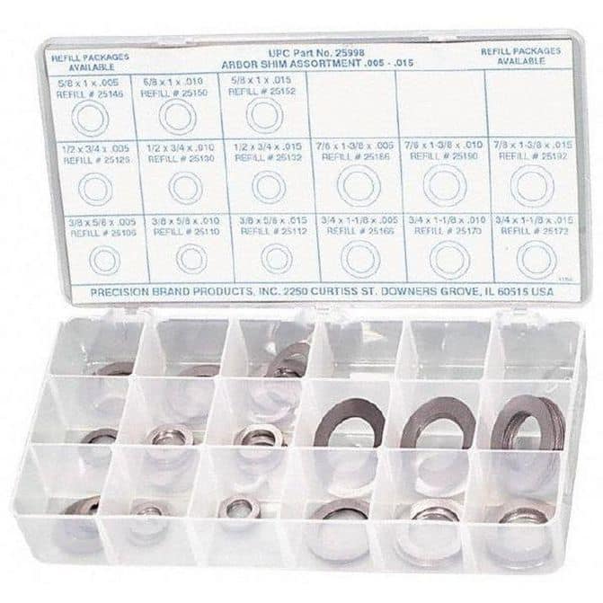 Manufacturer Part Number: 25999|Product Type|Arbor ShimMaterial|SteelMaterial Grade|Overall Length (Inch)|Overall Length (mm)|Width (Inch)|Number Of Pieces|150Slot Width (Inch)|Assortment Thicknesses (Decimal Inch)|Assortment Shim Thicknesses|Colors|Additional Information|Slot Width|System Of Measurement|InchWidth (mm - 2 Decimals)|Product Service Code|UNSPSC Code|