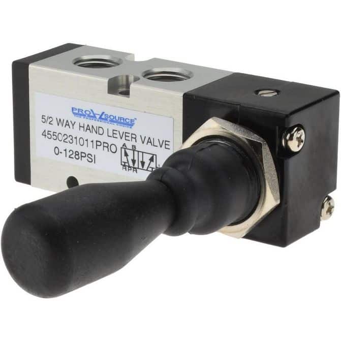 Manufacturer Part Number: 4550231011PRO|Valve Design|Hand LeverActuator Type|Lever; DetentDesign|5-WayInlet Size|Outlet Size|Cv Rating|0.9760Maximum Working Pressure (bar)|Minimum Working Pressure (psi)|Maximum Working Pressure (Psi - 3 Decimals)|Thread Type|NPTActivation Method|Minimum Working Temperature|Maximum Working Temperature|Handle Movement|Color|Thread Size|Number of Ports|5Air Flow|Port Locations|Return Type|Air Valve Type|Mounting Style|Type|Lever; 5-Way Valve; Manual Mechanical ValveOperating Force|Height (Decimal Inch)|3.97Number Of Positions|2Length (Decimal Inch - 4 Decimals)|3.4440Width (Decimal Inch - 4 Decimals)|1.3770UNSPSC Code|40141603