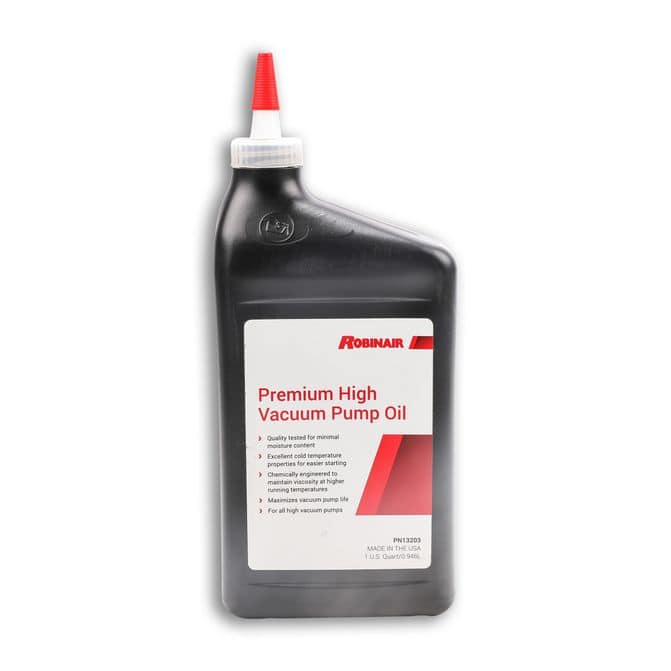 Orders placed after 4PM (CST) deliver on the next business day.Product Details: The Robinair Premium High Vacuum Pump Oil is a high-performance oil designed to maximize the life of your vacuum pump. This 1 quart bottle of oil is formulated with thermal stability to resist break-down due to heat and excellent cold temperature properties for easier starting. It also features a lower moisture content due to special packaging and handling procedures. This oil is engineered to maintain viscosity at higher running temperatures, ensuring your vacuum pump runs smoothly and efficiently.