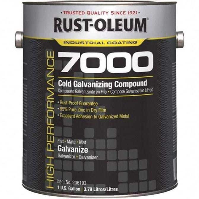 Manufacturer Part Number: 206193|Type|Product Type|Zinc Cold galvanizing CompoundContainer Size|1 galContainer Size Range|1 to 4.9 galContainer Type|PailFood Grade|NoVOC Content (g/L)|420.00VOC Content (%)|VOC Content (Lb./gal)|Color|Net Fill|Composition|Water-BasedApplication|Iron; SteelStandards|OSHASeries|Certification|ASTM D-1654; ASTM D-522; ASTM D-5894; ASTM D-610; ASTM D-714; DOD-P-21035A; MIL-P-26915CFormula/Composition|Net Weight (Qt.)|Net Weight (Lb.)|28.30Net Weight (Gal.)|1.00Net Weight (oz.)|Fully Dry Time (Hours)|2Trade Name/Number|Coverage in Square Feet|Recoat Dry Time (Hours)|24Coverage (Sq.Ft./Gal.)|300 to 500Minimum Temperature (Deg F - 3 Decimals)|Minimum Temperature (C - 2 Decimals)|Maximum Temperature (F) ( - 0 Decimals)|122.00Maximum Temperature (C)|50.00Product Service Code|UNSPSC Code|