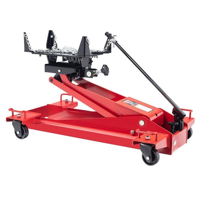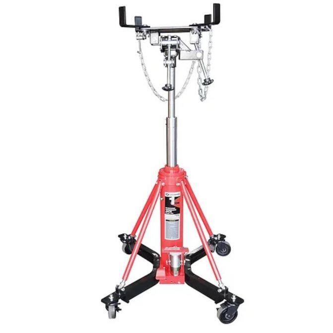 High height - 36.62 in; Load capacity - 1.5 ton; Low height - 8.7 in; Tilt capacity front, rear, & side - 10 degrees; Material - Steel; Color - Red - Use for the removal, installation and moving of heavy duty diesel truck transmissions.