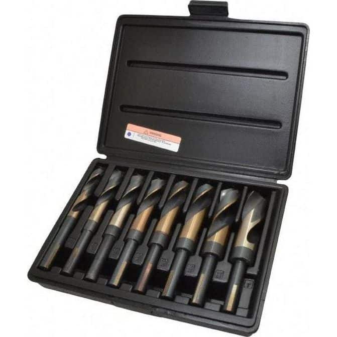 Manufacturer Part Number: 090595|Drill Bit Set Type|Reduced Shank Drill BitsNumber of Pieces|8Tool Material|High-Speed SteelMinimum Drill Bit Size (Frac Inch)|9/16Maximum Drill Bit Size (Frac Inch)|1Minimum Drill Bit Size (mm)|Maximum Drill Bit Size (mm)|Shank Type|ReducedCoating/Finish|Black Oxide; Bronze OxidePoint Type|Split PointMinimum Drill Bit Size (Letter)|Minimum Drill Bit Size (Inch)|Minimum Drill Bit Size (Wire)|Maximum Drill Bit Size (Inch)|1Maximum Drill Bit Size (Letter)|Maximum Drill Bit Size (Wire)|Drill Point Angle|118Series|T98FHDShank Size|Number Of Hole Sizes|Drill Bit Size 4 (Decimal Inch)|Drill Bit Size5 (Decimal Inch)|Drill Bit Size3 (Decimal Inch)|Drill Bit Size2 (Decimal Inch)|Drill Bit Sizes Included (Inch)|9/16;1Drill Bit Sizes Included (Wire)|Drill Bit Sizes Included (mm)|Drill Bit Sizes Included (Letter)|Drill Bit Sizes Included (Decimal Inch)|Step Increments|1/16Number Of Flats|Minimum Hole Size (Inch)|Maximum Hole Size|1Shank Diameter|1/2 inShank Taper Designation|Overall Length|7.75Contents|(8) Reduced Shank DrillsCoolant Through|NoCutting Direction|Additional Information|Drill Length Type|Reduced Shank LengthFastener Size Compatibility (Inch)|Fastener Type Compatibility|Flute Length|Material Set Type|Specification Designation|Specification Number|Standards|Step Diameter|UNSPSC Code|27112800Storage Unit Height|Storage Unit Length|Storage Unit Material|PlasticStorage Unit Width|System Of Measurement|InchTap Thread Size|Tool Application|Metalworking; Multipurpose Drill BitsTool Performance|Heavy DutyProduct Service Code|5133Storage Unit Type|Case